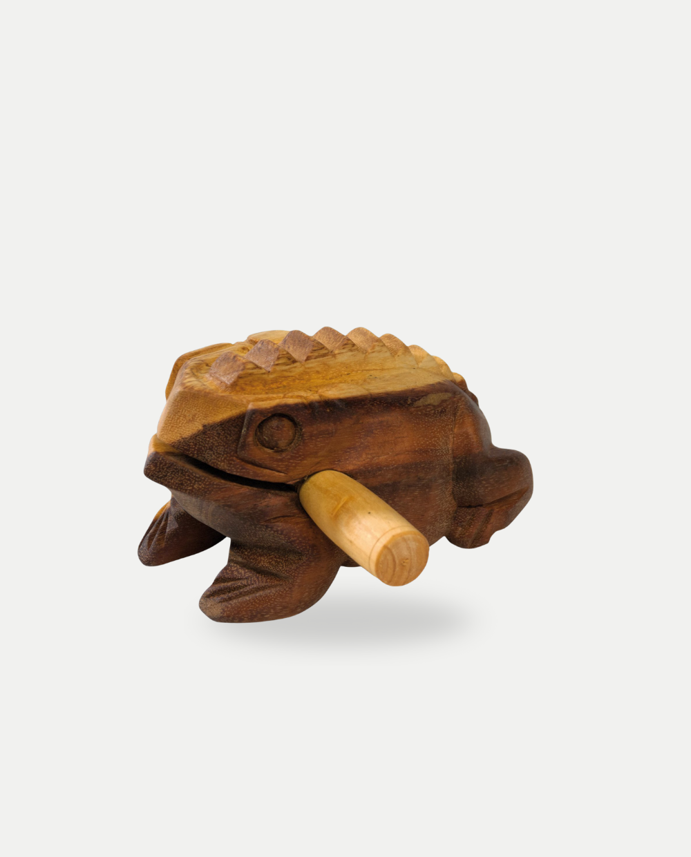 Intagliata a mano da un unico blocco di legno, ogni rana è un pezzo unico: la sua cassa armonica amplifica il suono in modo sorprendente, permettendo di creare il canto autentico della rana semplicemente facendo scorrere un bastoncino lungo la sua schiena.