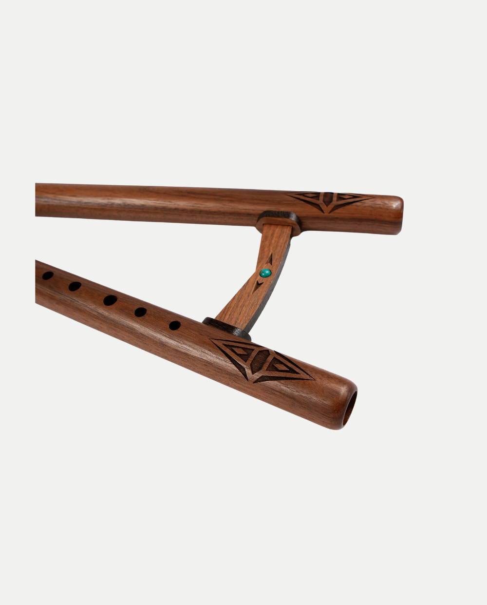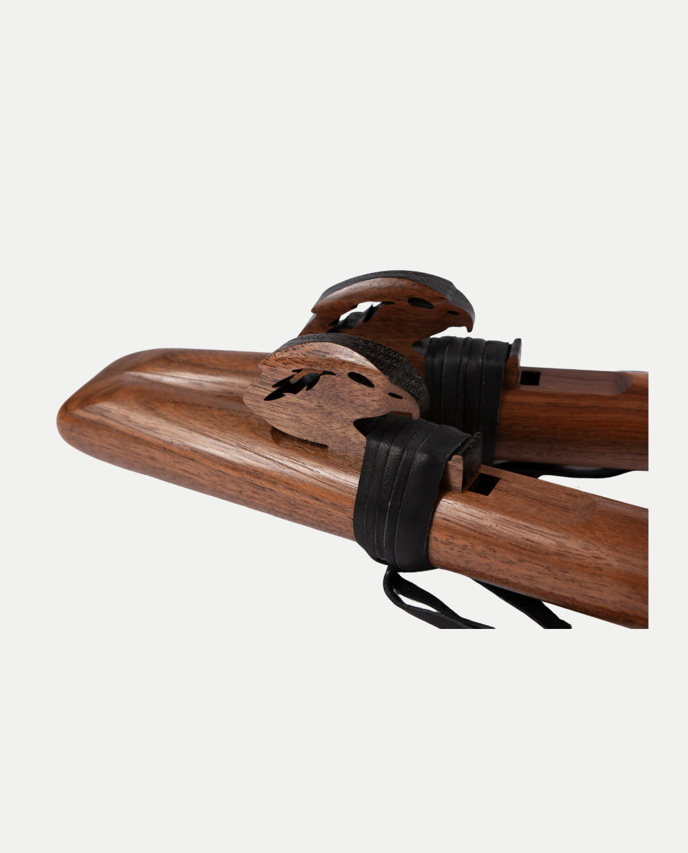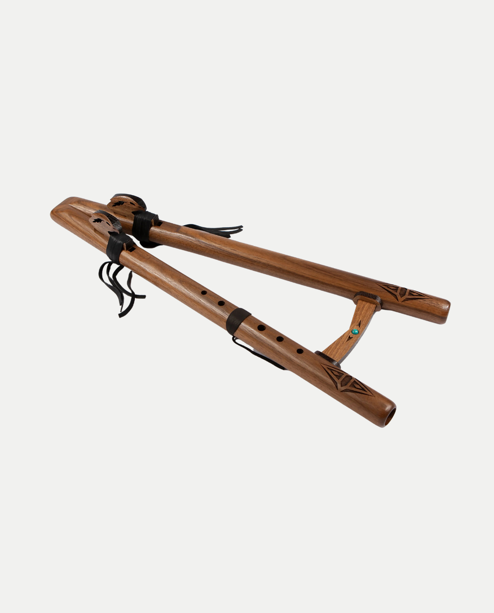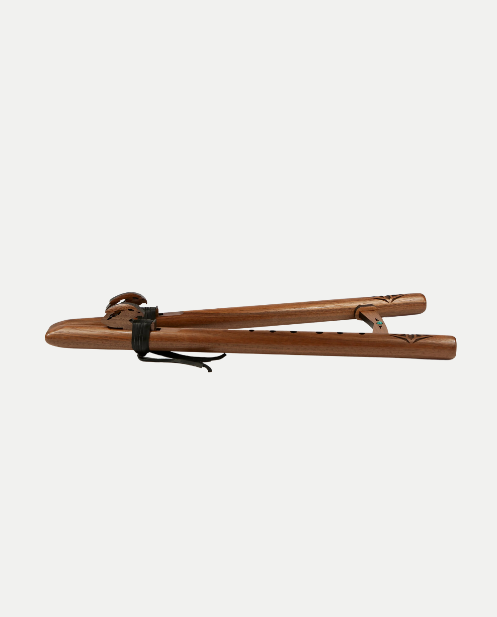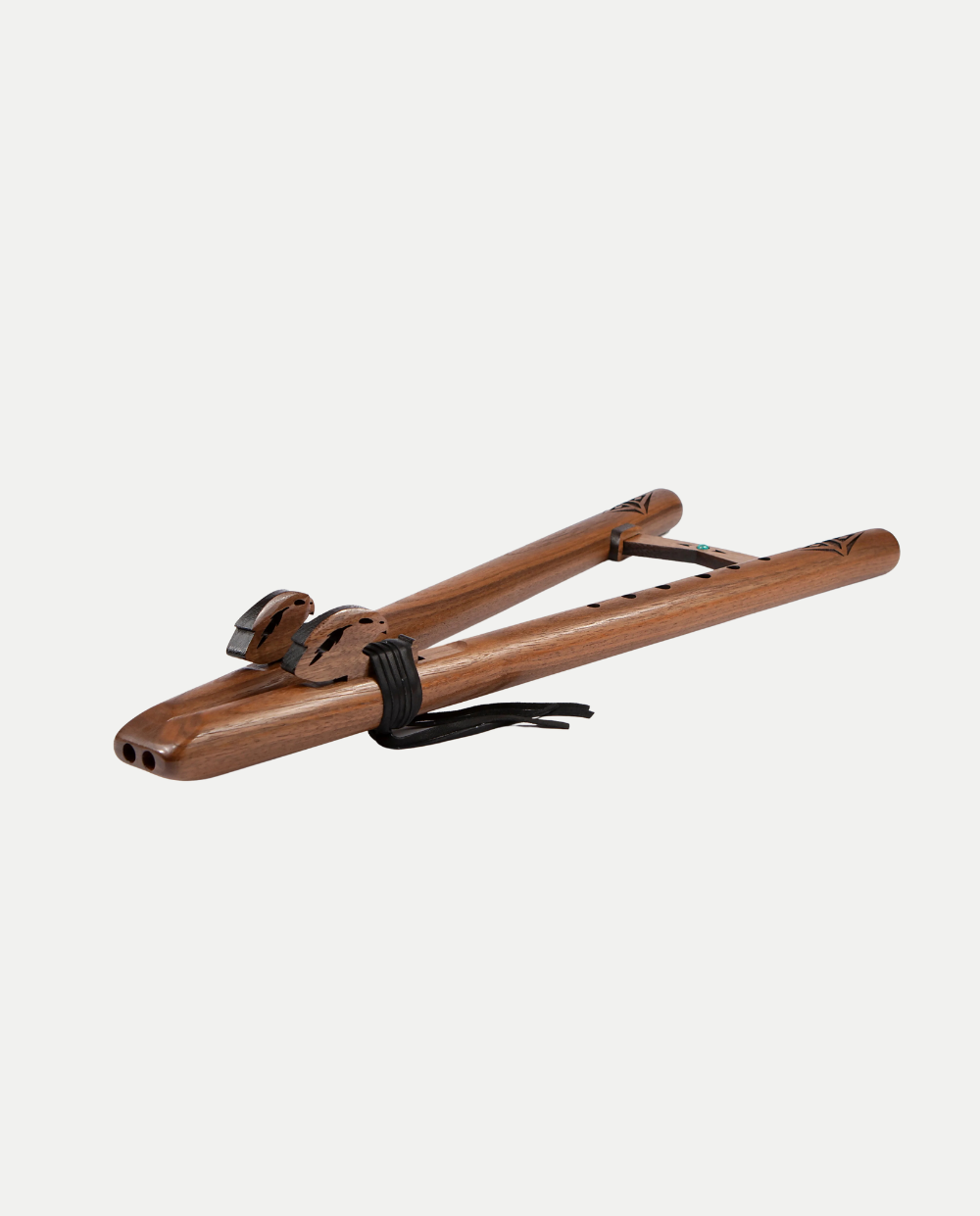 Il Double Eagle Flute in tonalità di Fa♯ minore (F♯ minor) è uno strumento tradizionale a doppia canna, realizzato artigianalmente in Noce Americano, un legno duro noto per le sue ottime qualità acustiche e la varietà naturale delle sue tonalità, che vanno dal marrone scuro al biondo dorato.