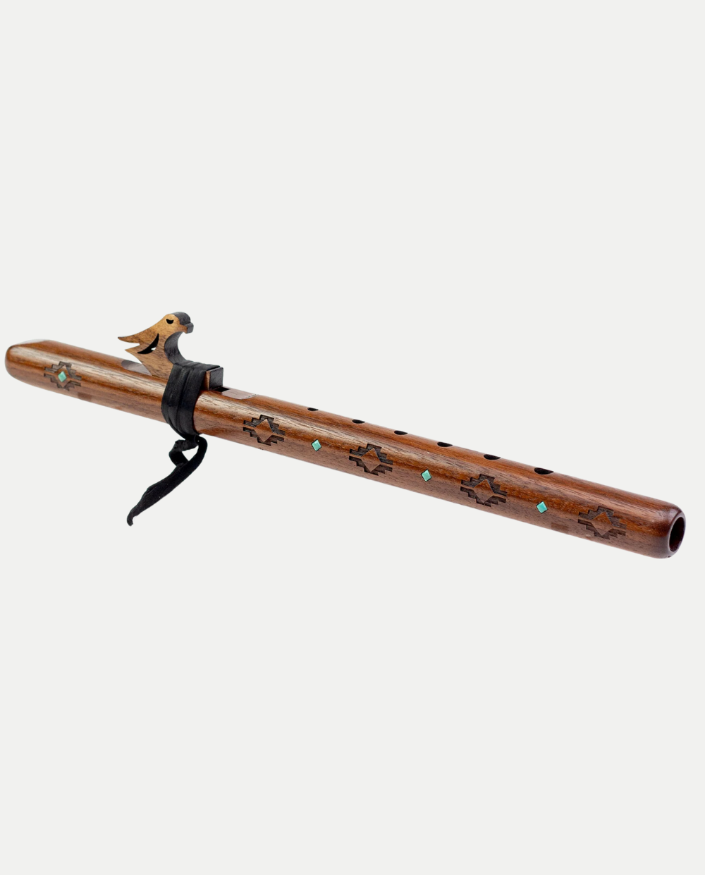 Il Flauto Kestrel in tonalità di Re minore (D minor) è uno strumento artigianale compatto, realizzato in Noce Nero nazionale. Questo legno duro dona al flauto un timbro chiaro e brillante, ulteriormente valorizzato dalla rifinitura con oli naturali non tossici. Il corpo dello strumento è arricchito da raffinati intarsi in pietra Turchese, che aggiungono un tocco decorativo e ne esaltano il valore come oggetto di arte funzionale.