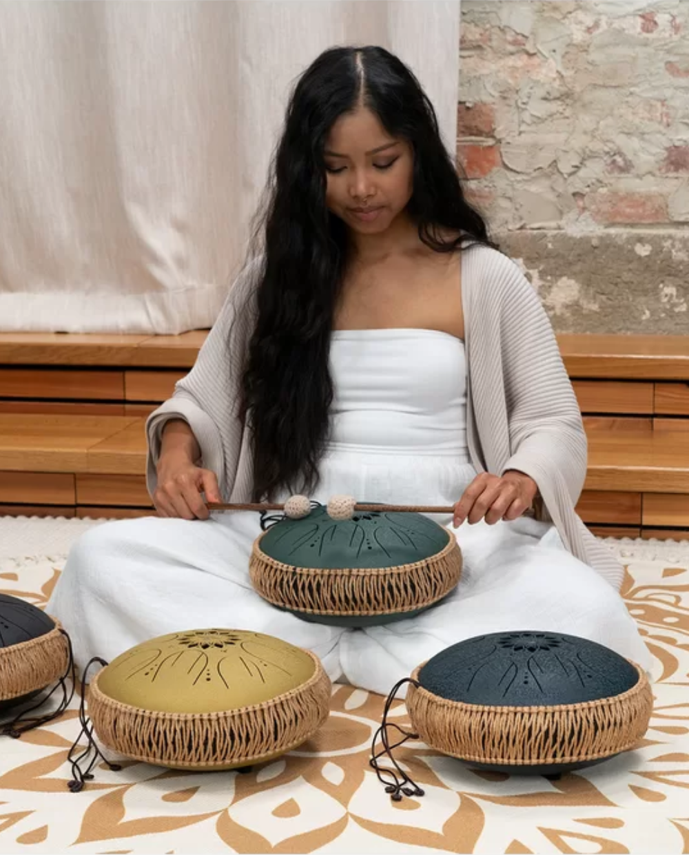 The Sonic Energy Octave Steel Tongue Drum is made of high quality stainless steel and tuned to 432Hz with a deep and meditative sound, very easy to play, suitable for many meditative and relaxing areas with C Minor scale .