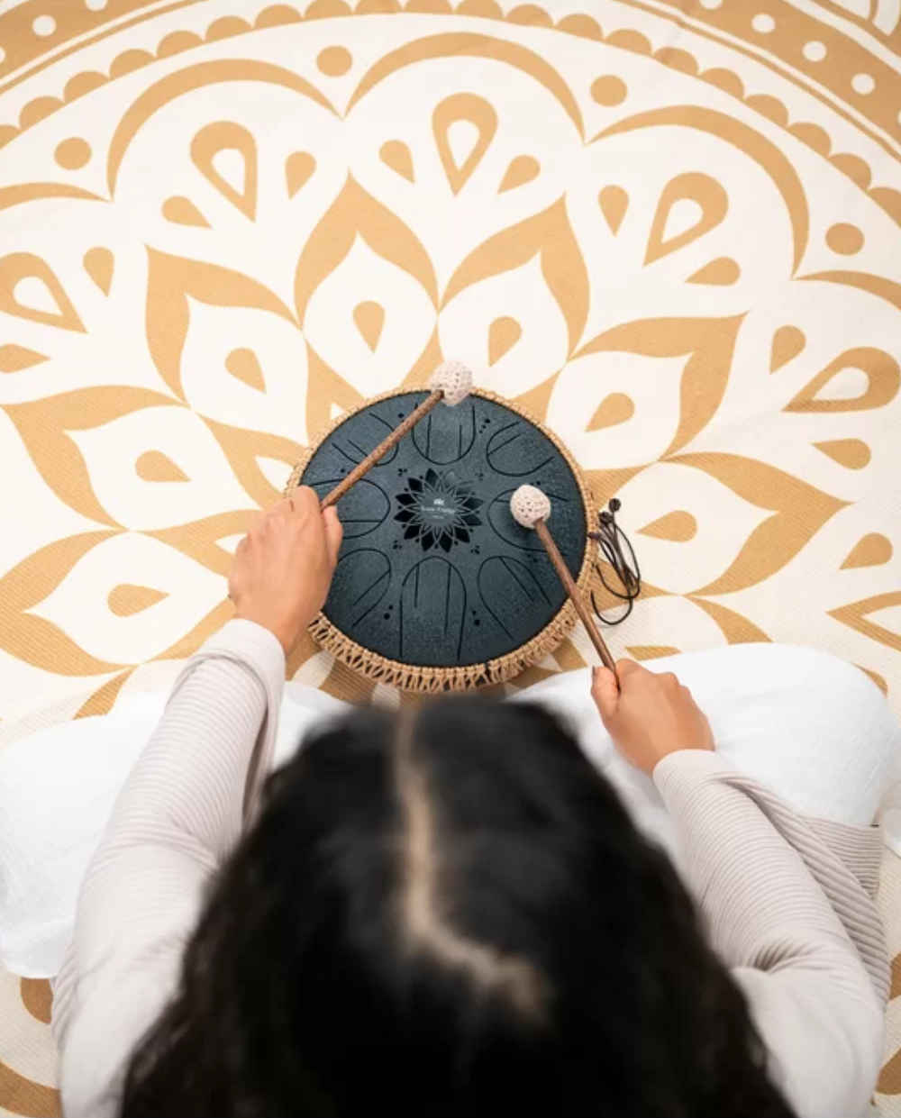 With its octaves it creates a beautiful and meditative sound similar to the tone of a handpan. The Medium Octave Steel Tangue Drum can be played with your fingers or with sticks. To start playing, simply place it on a flat surface or on your lap. The drum comes with two wooden sticks with rubber heads and a zippered carrying bag with handle.