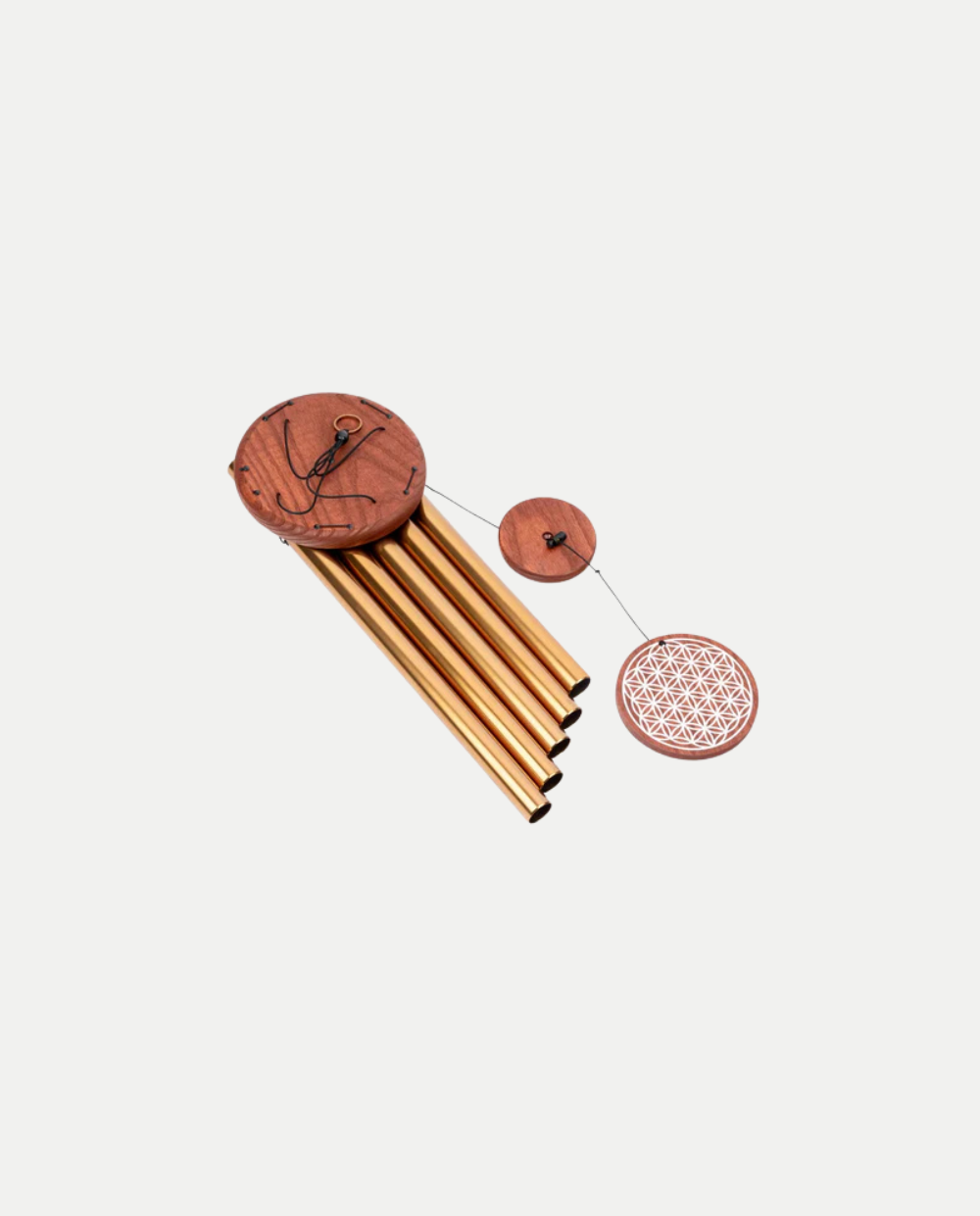 The design includes 5 bronzed aluminum bars and an elegant "Flower of Life" symbol at the base of the cord, adding an aesthetic and spiritual touch. The height-adjustable pendulum allows you to vary the frequency of the strikes or stop them completely, adapting the sound to your preferences.