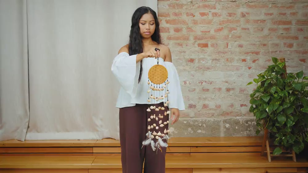 Whether played by hand or hung as a charming hanging mobile, Kenari Chimes | Flower of Life - Medium add a touch of magic and tranquility to any space. With their light weight and attached loop at the top, they are easy to handle and place wherever you desire. Crafted from high-quality materials like mahogany and Kenari seed nut shells , these chimes are not only beautiful to look at, but also designed to last.