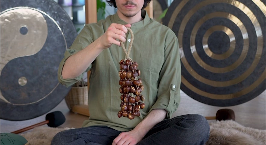 Pala Shaker Large | Discover the Meinl Sonic Energy Pala Shaker, a unique and versatile instrument made from Pala walnut shells mounted on a comfortable wrist strap. With its soft and quiet sound, this shaker is perfect for low-volume environments. Add a special touch to your music with the Pala Shaker by Meinl Sonic Energy.