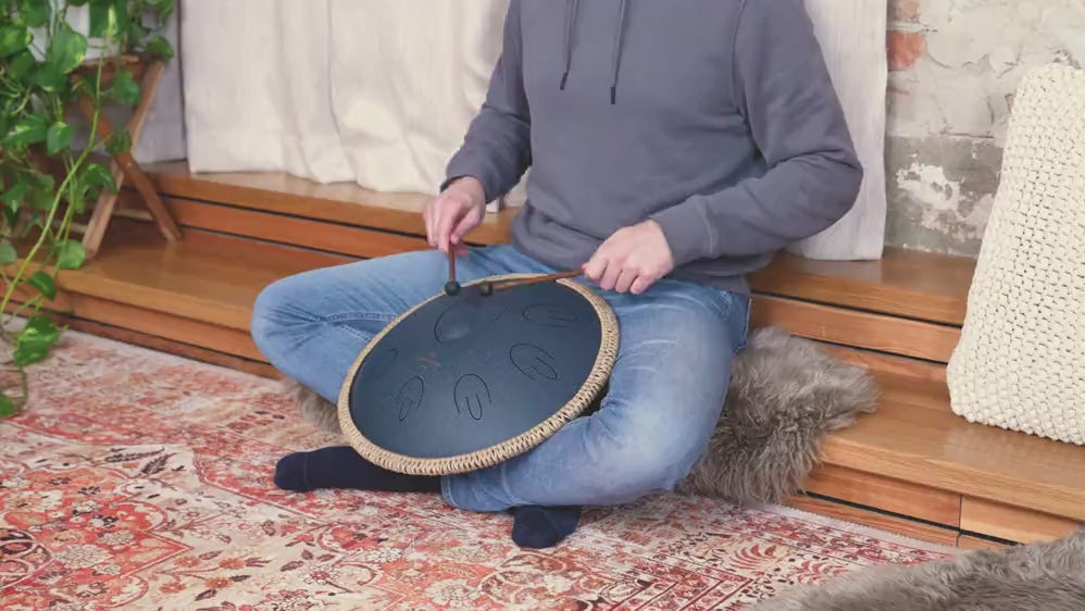 There are also three silicone feet at the bottom to prevent the drum from slipping. You can play the Octave Steel Tongue Drum with sticks or fingers. Just place it on a flat surface or on your lap to start playing.