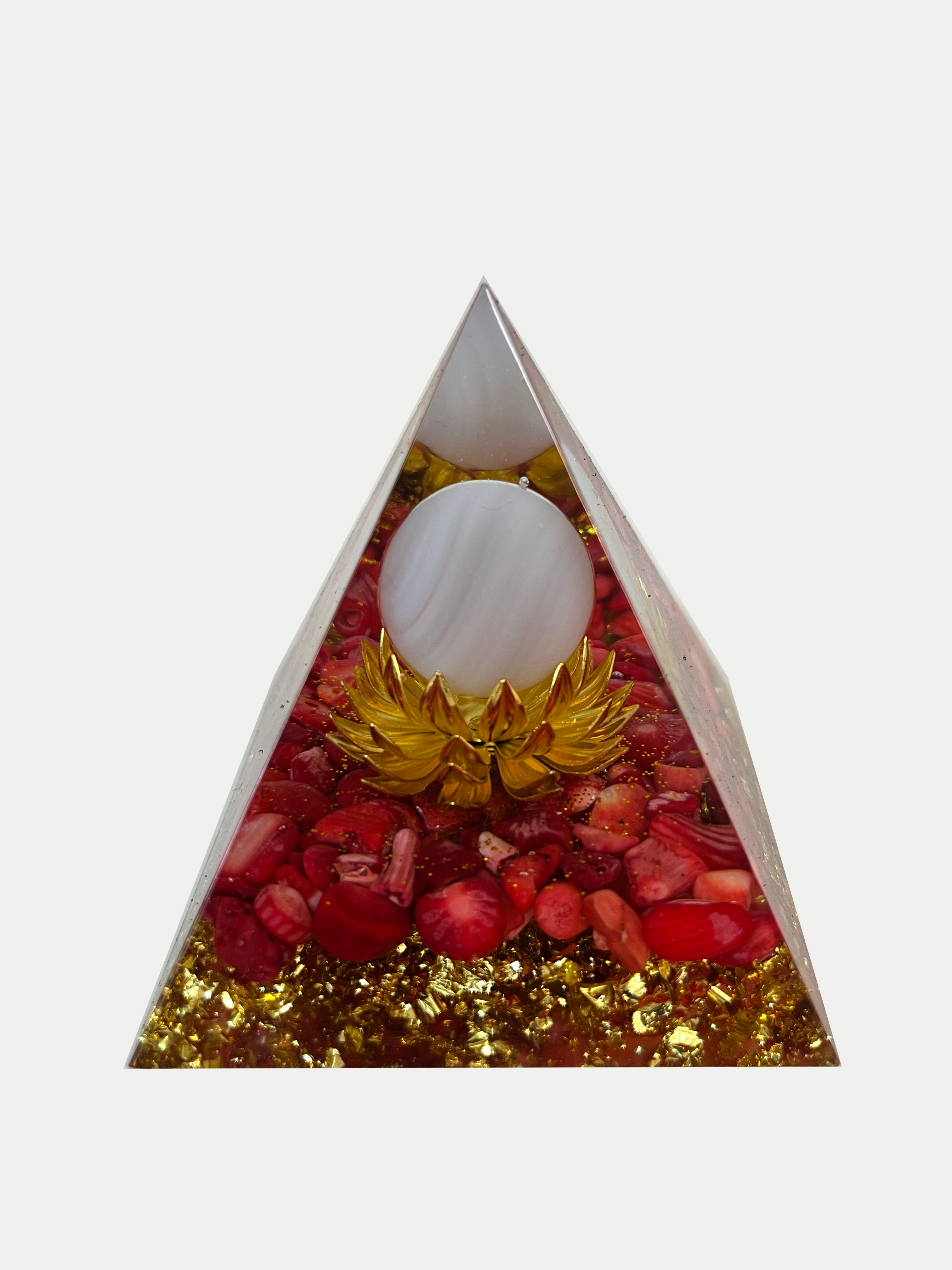 The Pyramid of orgone flower in copper, sphere in opal and coral It is related to the Sacral Chakra , known as Svadhisthana . It is associated with our primal emotions. Benefit from this pyramid and enjoy the relaxation that comes from it!