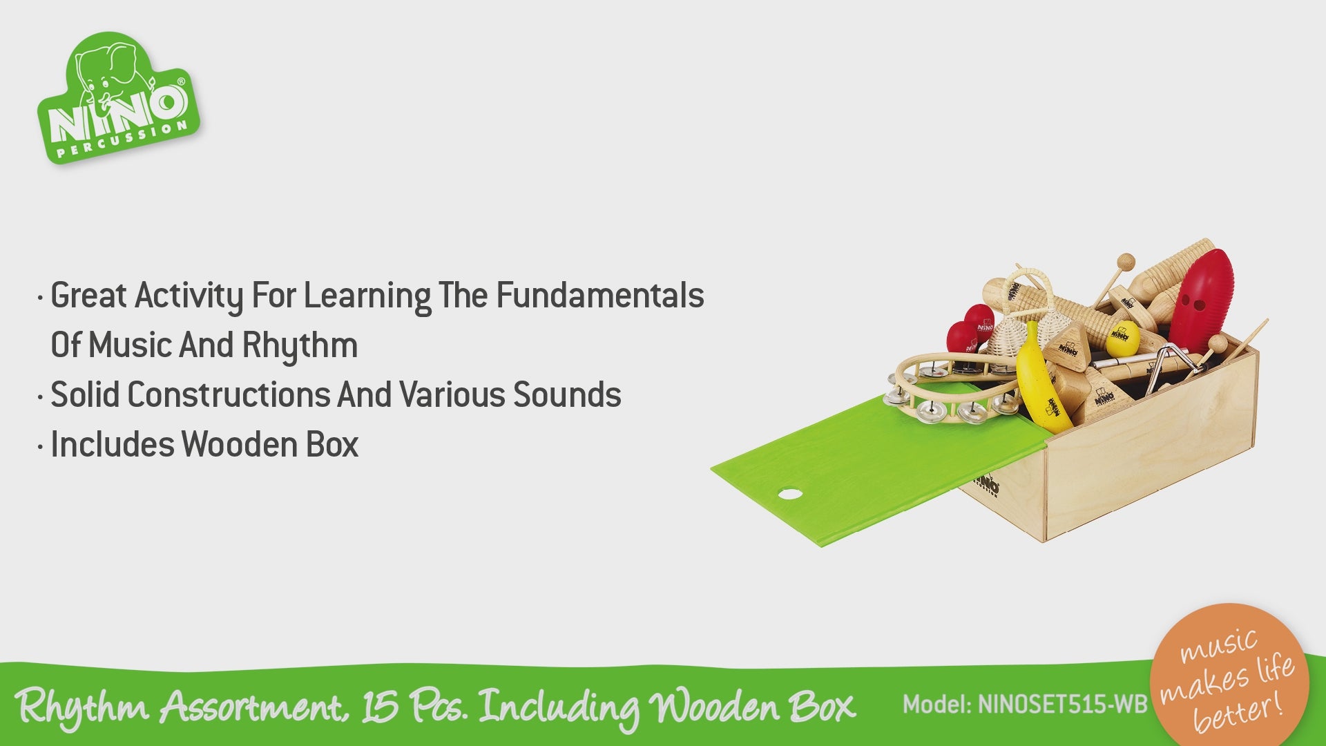Includes NINO Tool Sets Percussion in your nursery or school and discover the joy of teaching music with quality instruments. Whether you are looking to start a new percussion program or enrich your current music curriculum, NINO Sets Percussion are the ideal choice.